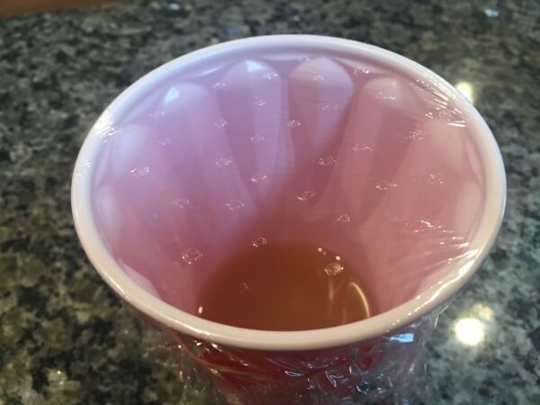 I like to use a rubber band to hold the plastic wrap over the top of the cup, or you can use tape.