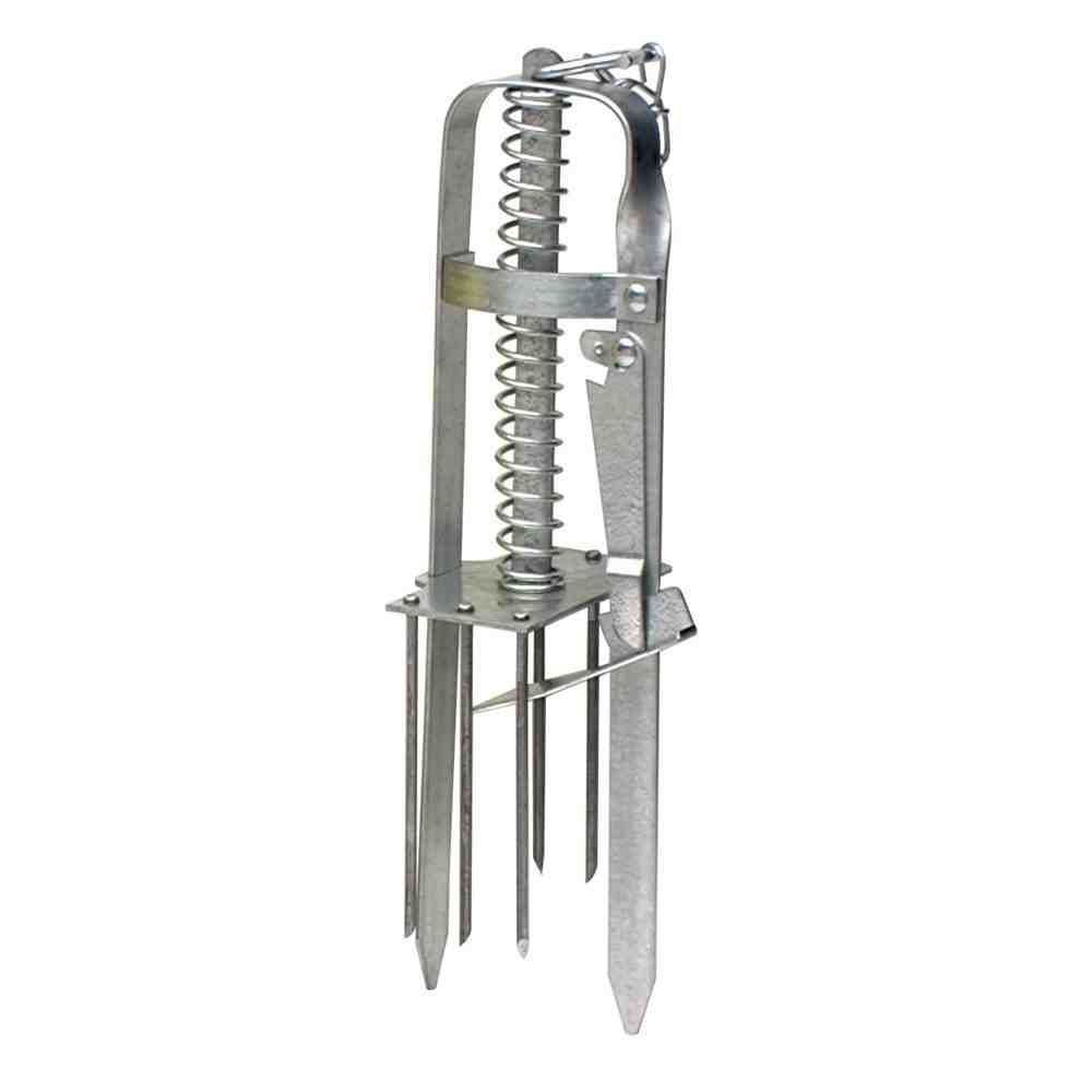 Also referred to as a harpoon trap, or a spear trap, the plunger trap uses multiple sharp spears that pierce through the ground and the mole when activated, killing the mole.